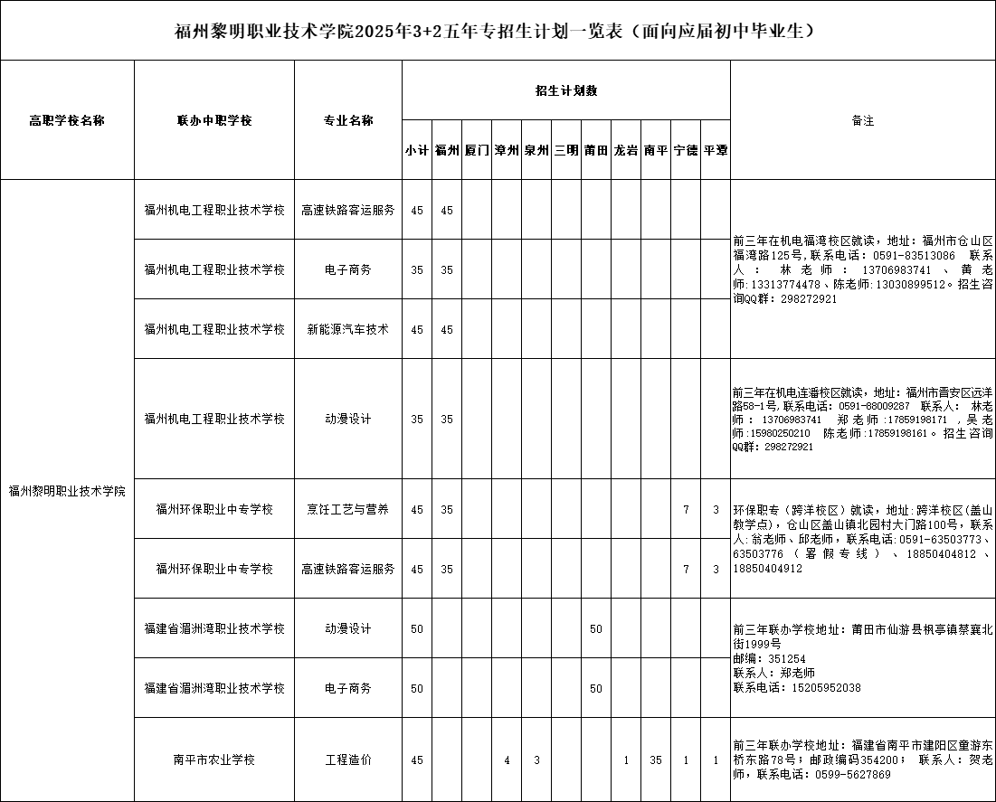 福州黎明职业技术学院2025年3+2五年专招生计划一览表(面向应届初中毕业生)