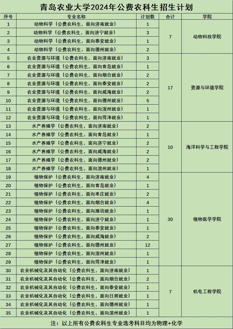 2024年,青岛农业大学共有动物科学、农业资源与环境、水产养殖学、植物保护、农业机械化及其自动化5个公费农科生专业,35个填报志愿(专业+面向就业地市),招生计划数71人。其中,水产养殖学、农业机械化及其自动化为我校2024年新增公费农科生专业。